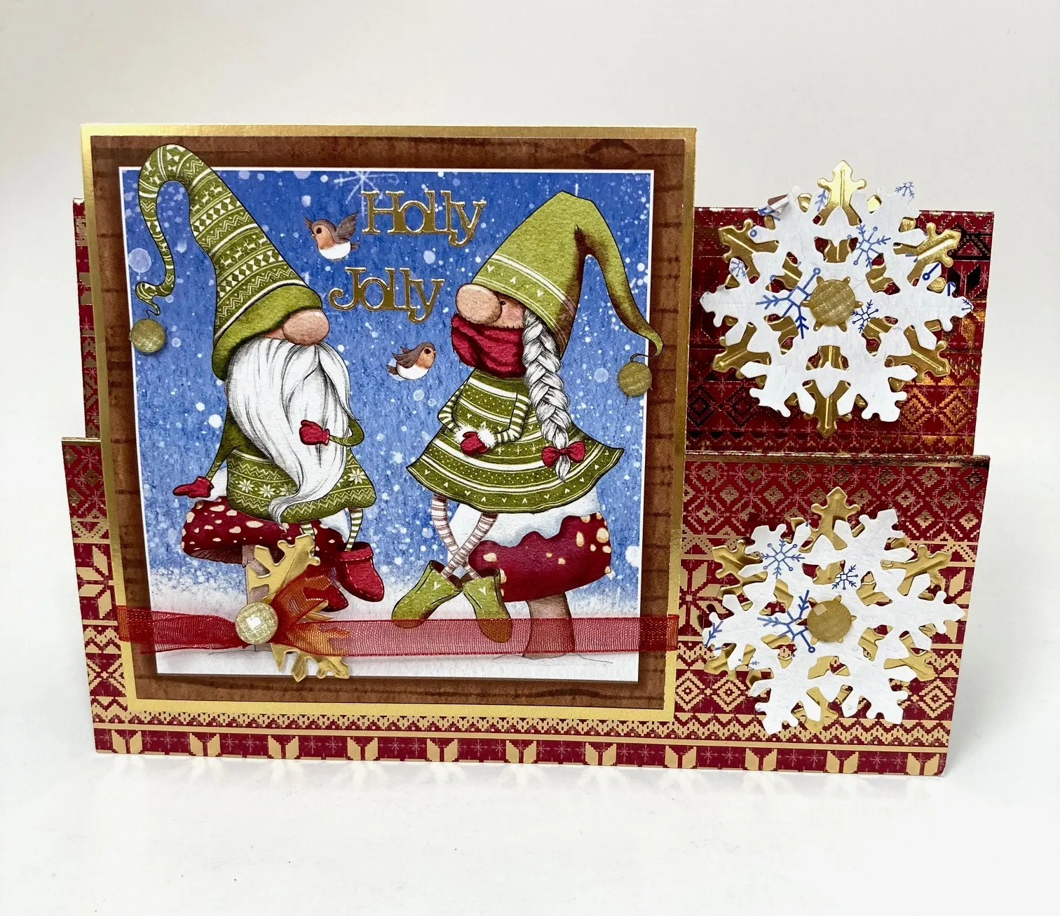 Card front: Select the blue snowflake background page and the two gnomes on the snowy mushroom page. Die-cut two snowflakes from the snowflake page, three from the gold cardstock (save two of the centers evacuated areas for the inside), and one from white cardstock. Mat the two gnomes square onto gold metallic cardstock with 1/8” borders. Tape a 5" length of red ribbon 3/4" from the bottom. Tie a 3" knot onto the ribbon 1" from the left.