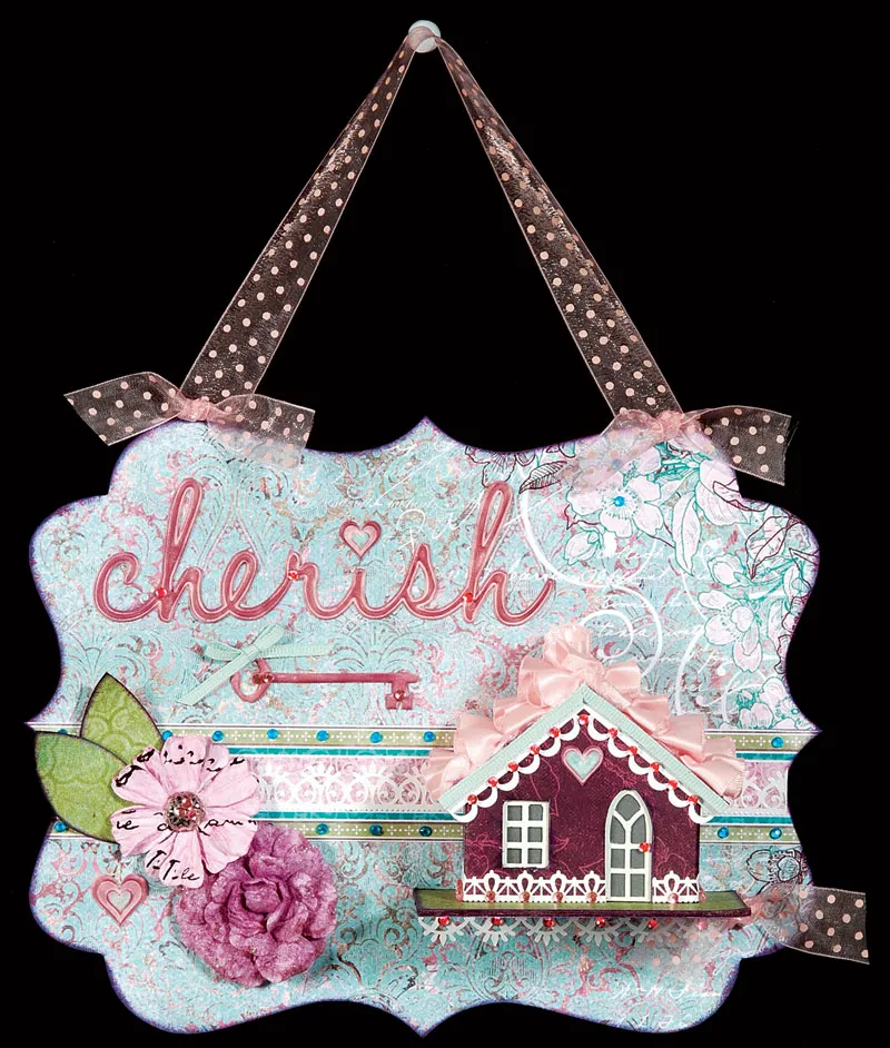Cut a lacy border sticker to fit beneath the base of the house and add to the label as shown. Embellish the sticker with pink bling. Add turquoise bling to the flowers in the design of the background paper and the paper strip as shown. Add pink bling to the word, key, and center of the chalked flower. Tie an aqua grosgrain bow and Zot to the key. Zot knotted pink dotted ribbon near the base of the house.