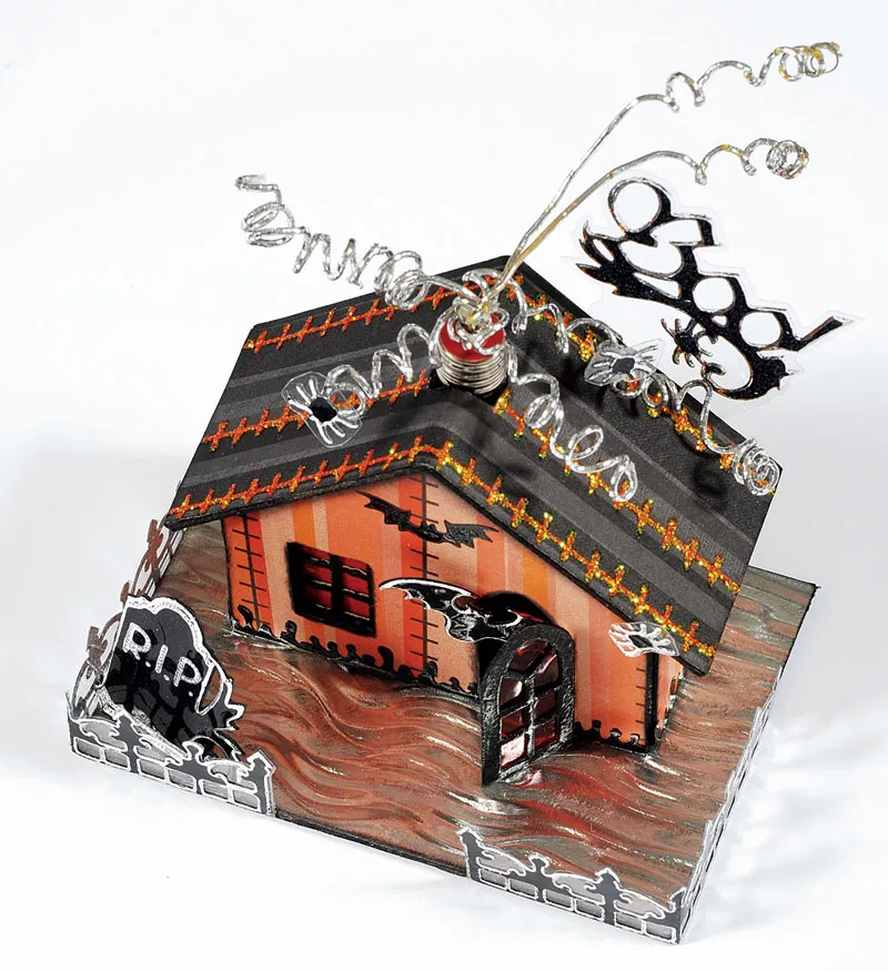 Cover the chipboard base with Silver Ripple paper and trim edges evenly. Ink edges black. Glue the house onto the base, 1/8” from the back edge. Let dry. Glue embossed door in place, leaving an opening for Dazzle bat to fly out.