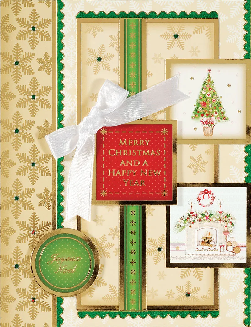 Pop out small square foiled die-cuts from “A Magical Christmas” and glue the Christmas tree square and fireplace square evenly spaced on the right side of the card. Foam tape the red square with words centered on the green border, overlapping the first squares as shown. Foam tape “Joyeux Noel” on the lower left portion of the card. Tie a white satin bow (ribbon included in kit) and cut the ends in a “V”. Zot™ the bow on the upper left corner of the red square.