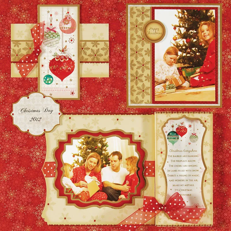 Mat remaining photo on red dots paper with 3/8” borders. Glue to tan foiled cardstock with snowflake border at the left side, trimming edges evenly with the photo mat. Mat on ivory circles paper with 1/8” borders. Mat on metallic gold paper with 1/8” borders. Glue to the page, 1/2” from the right side and 1/4" from the top. Foam tape “Happy Christmas” circle overlapping the photo and border as shown.