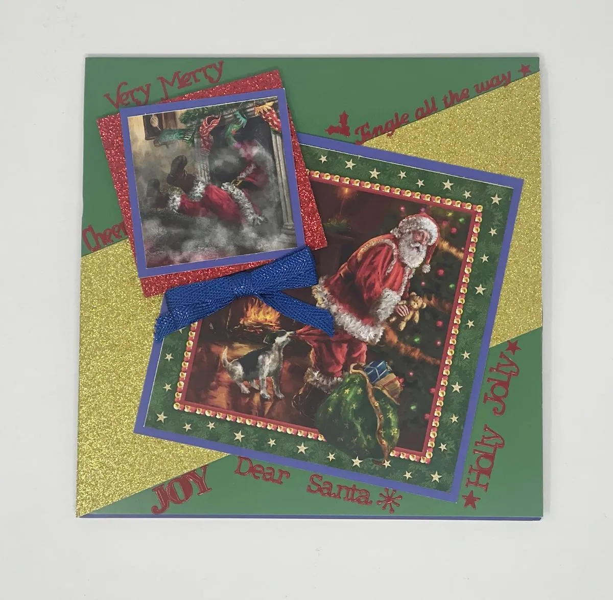 Use the green 6x6 card and the Santa calamity page from the Picture Perfect Paper Pad. Mat two images on blue Adorable Scorable leaving 1/8" blue borders. Cut a 3"x 8" strip of the Gold Glitter Cardstock and glue as shown then trim to ft. Glue largest image at an angle as shown. Foam tape a 2 1/2" square of Red Glitter Cardstock as shown then glue the smaller image at an angle on top. Zot™️ a 2" wide blue bow below this. Place red Christmas Greetings Dazzles™️ along the wacky angles.