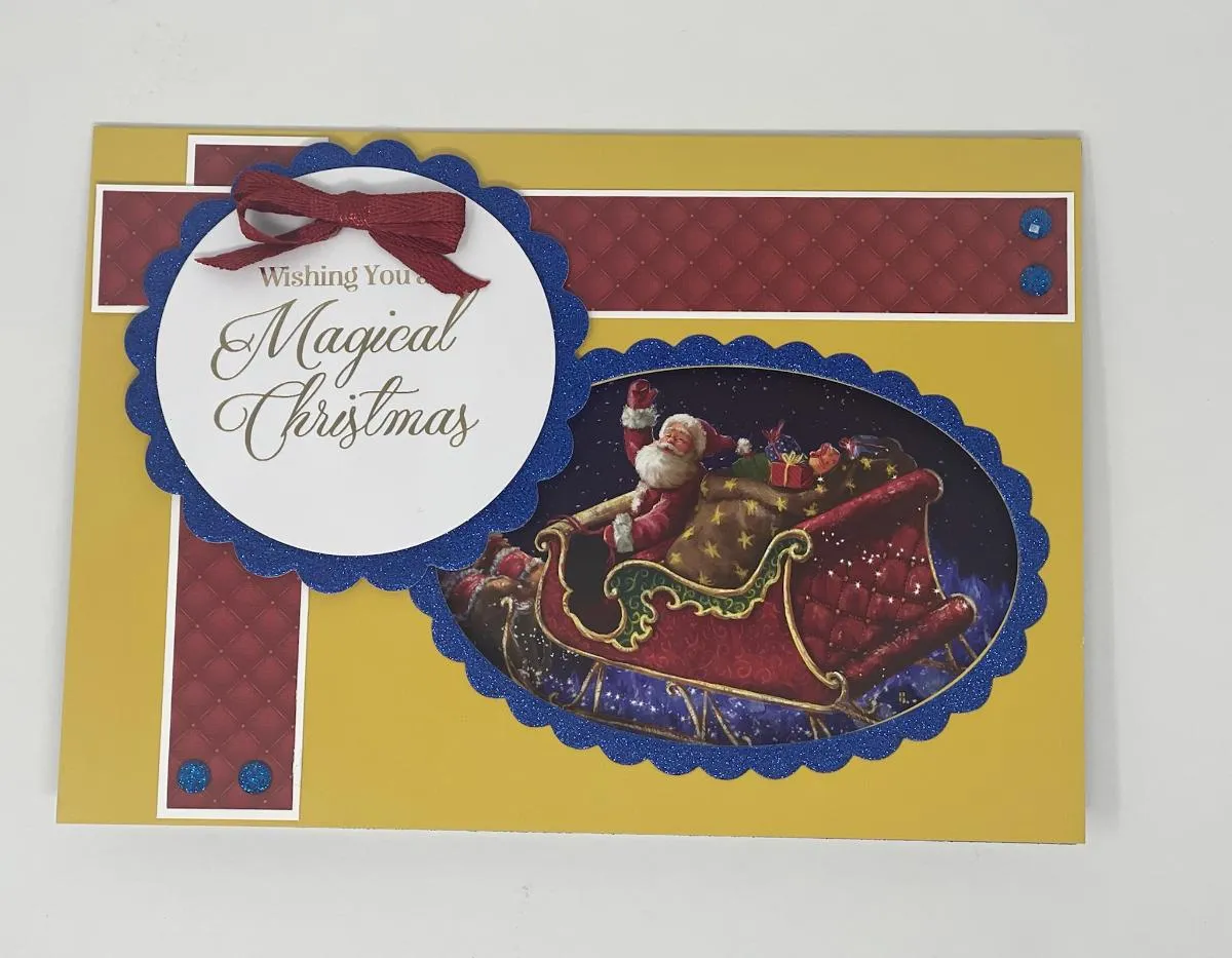 Card Inside- Cover inside with glue, place Blue Glitter along two edges, press down, turn over and trim off the excess. Glue the large focal to the bottom as shown. Place red Diamond Sparkles at each corner. Position the red Christmas Greetings Dazzles™️ as shown.