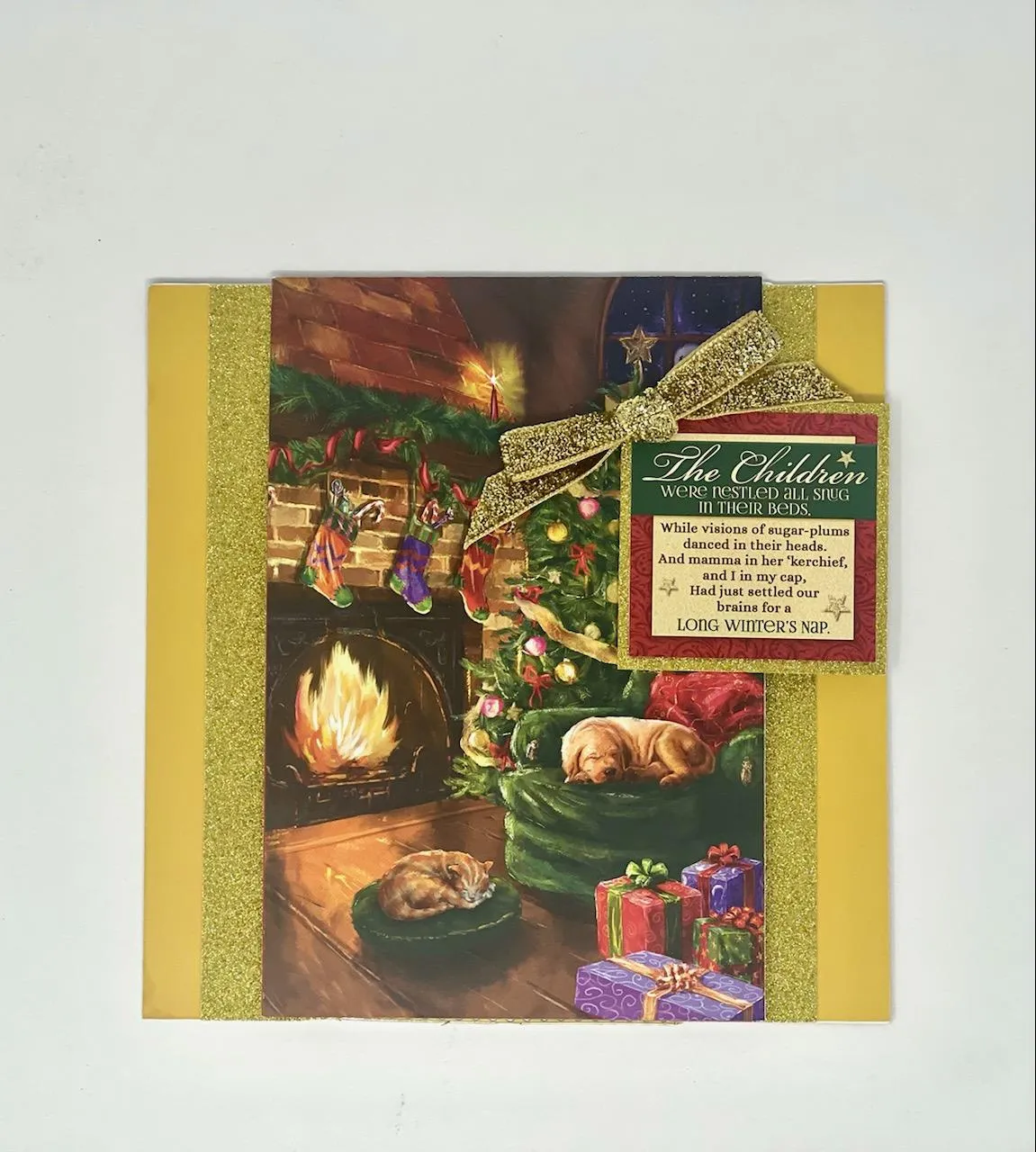 Trim 1" off each side along the fold of the card front. Glue the large image to the front flap. Mat the "The Children..." square on Gold Glitter Cardstock with a 1/8" gold border and foam tape as shown. Zot™ a 2" wide gold bow to the corner.