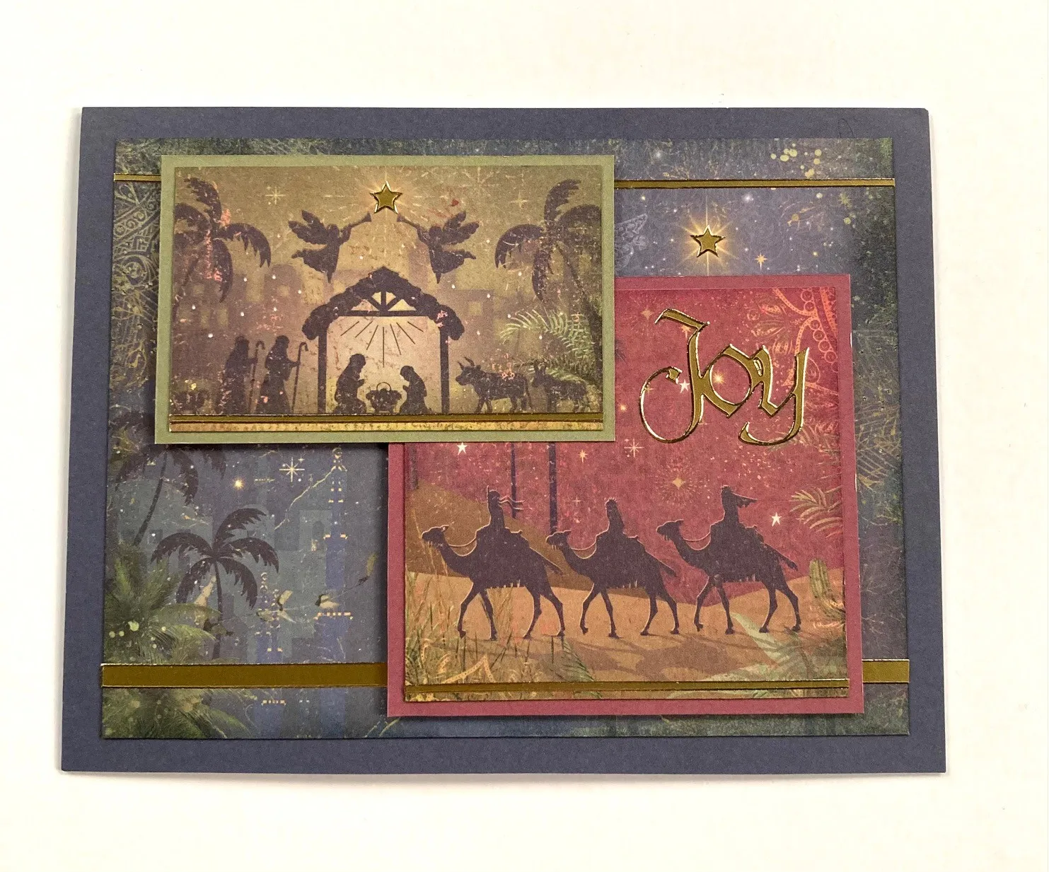 3. Cut the camel portion of the magenta O Holy Night cardstock to 3¼"x3" snd ink the edges with Orchid. Mat it on rose cardstock with ⅛" borders and place gold “Joy” Dazzles™ in the upper right corner. Foam tape both scenes to the card front, overlapping them as shown. Place gold star Dazzles™ on the printed stars.