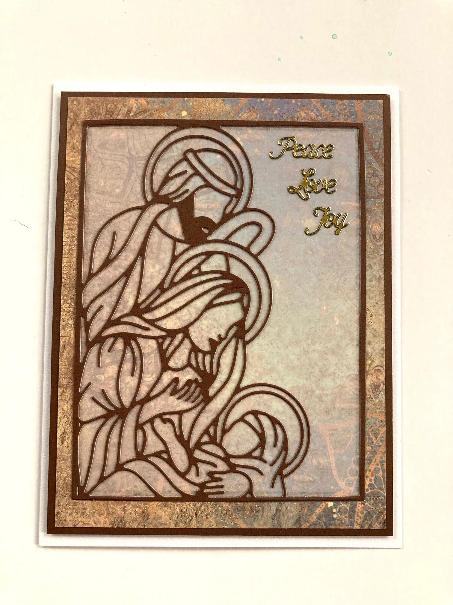 2. Die cut the scene die centered inside the rectangle die from brown cardstock. Die cut a rectangle from vellum, then use Sticky Specks™ to adhere it to the back of the brown scene die-cut. Place gold “peace,” “love” and “joy” Dazzles™ in the upper right corner, then glue the vellum to the center front.