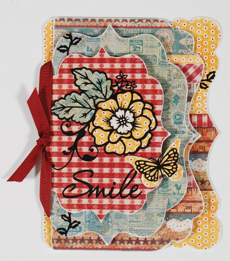Back a large flower sticker with yellow, white, and blue patterned papers then add to the red/white gingham shape as shown. Place “Smile” word sticker centered below the flower. Cut out the “celebration” label from the blue large labels paper and ink the edges black. Glue near the center of the yellow/tiny flowers side of the shape. Place a small flower/swirls sticker overlapping the top edge of the label as shown.