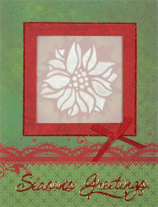 Cut a 3 1/2” square of Pergamano paper. Place the poinsettia stencil on an embossing pad and place the square over the stencil. Use stencil tape to hold the parchment in place. Use the embossing tool to emboss the parchment in the open areas of the stencil. Check the front of the parchment every once in awhile to check the appearance of the embossed areas. Once finished, turn the parchment over to the puffy side. Glue the edges of the parchment to the inside of the window.