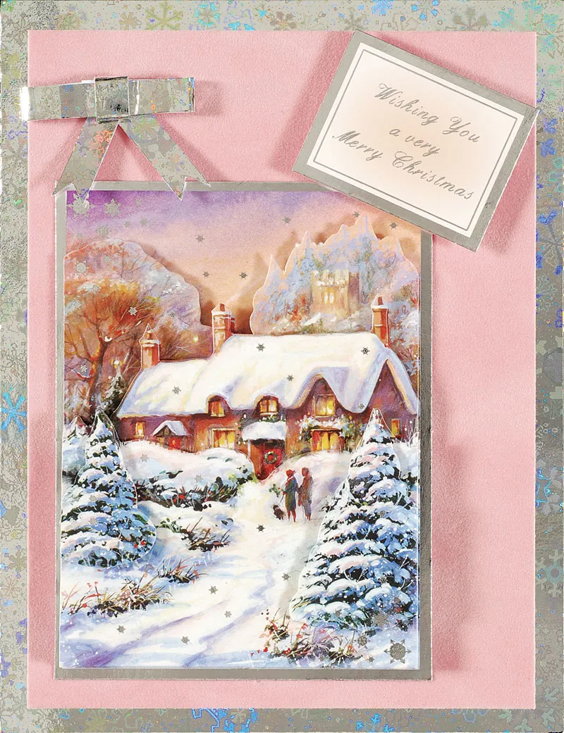 Card Inside: Cut a 3 1/2”x5” white cardstock. Sponge with Peach Chalk ink. Glue to coordinating snowflake cardstock with a 1/4” border. Glue to the center of Silver Snowflake Holographic paper, with a 3/8” border. Trim the round “Season’s Greetings” so the bottom edge is straight as shown. Glue to the bottom right edge of the cardstock. Trim the top and left side off of the round cottage picture, and glue to the upper left corner, as shown.