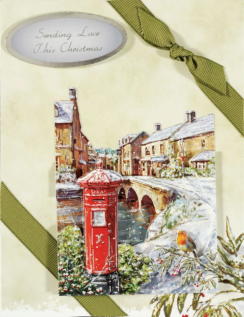 Assemble the post box dimensions with foam tape, omitting the back, silver lined piece. Glue 1/2” olive grosgrain ribbon to the lower left corner and upper right corner, as shown. Glue the assembled post box picture to the center of the card, 1/2” from the bottom.