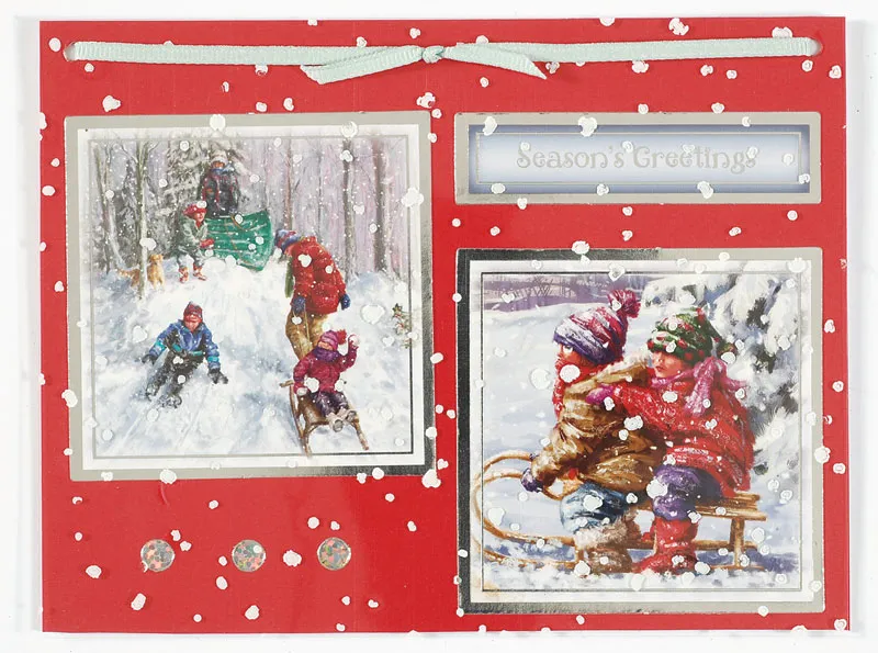 Card Front: Place your 5”x6 1/2” with the fold on top. Cut a 5”x6½” red cardstock. Glue the two square photos of kids on the sled, from “Fun In The Snow” on opposite corners of the card, as shown. Glue “Season’s Greetings” in the upper right corner, aligning with the top of left picture and right side of right picture. Place three Silver Dazzles™ under the right picture, as shown.