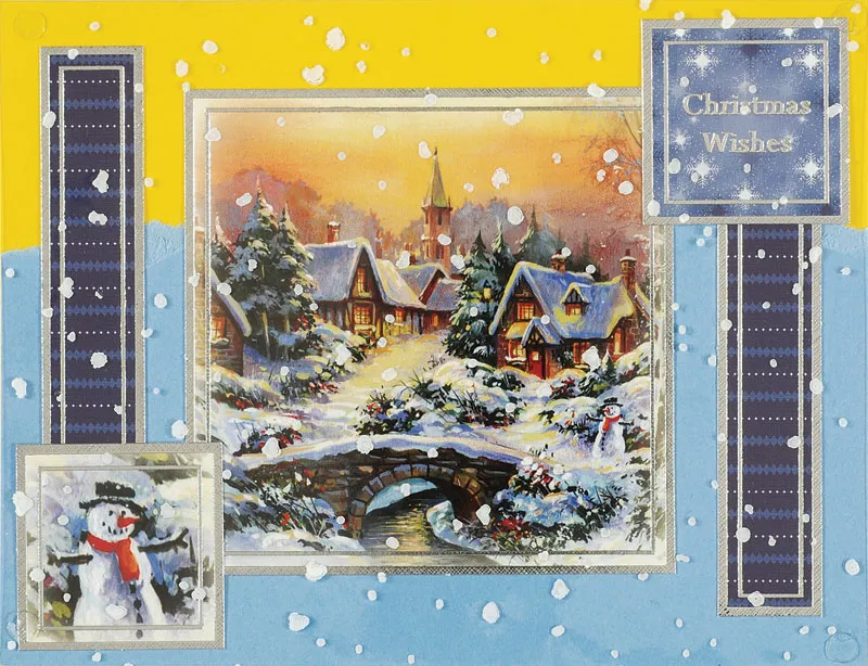 Pop out the bottom Snowy Village and coordinating blue strips and square. Glue the picture to the center of your card. Glue one blue strip to the left side of the card, 5/8” from the top of your card. Glue the second to the right of the card 5/8” from the bottom. Glue the snowman square to the bottom left, as shown. Glue the “Christmas Wishes” square to the top right, as shown.