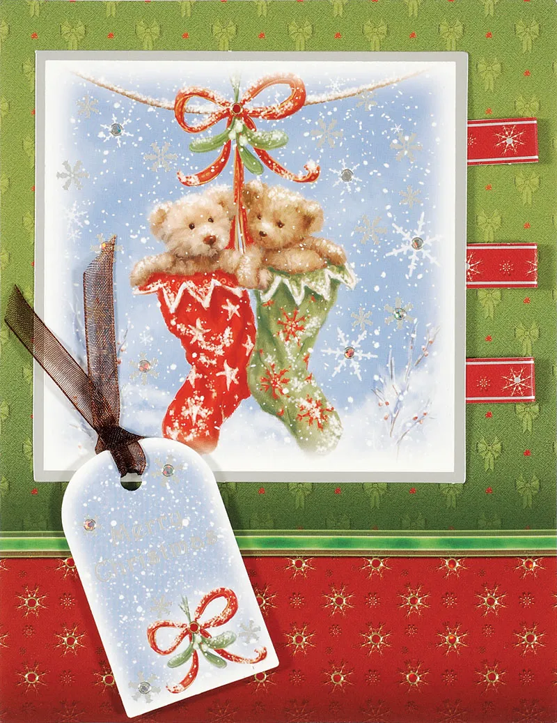 Card Front: Place your card with the fold on the left. Glue a 5”x6½” of Hunkydory red and green cardstock, as shown. Cut and fold three 1 1/2” strips of the Stocking Friends matching red border. Glue to the right side of Bear Square, as shown. Glue to card front 1/4” from the left side.