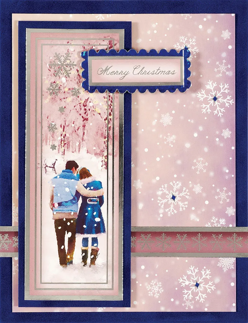 Card Inside: Cut a 4 1/2”x3 3/4” pink snowflake cardstock and glue to Navy Suede paper with a 1/4” border. Glue 1/4” from the top of your card. Glue a 3” snowflake trim to Navy Suede paper with a 1/16” border. Glue to the bottom of your card 1/2” from the left side, as shown. Glue small oval with bench to cover the “seam”. Pop out “To a Special Couple…” and trim with Blue Jewel Border Dazzles™. Glue to your card 1/8” from bottom edge.