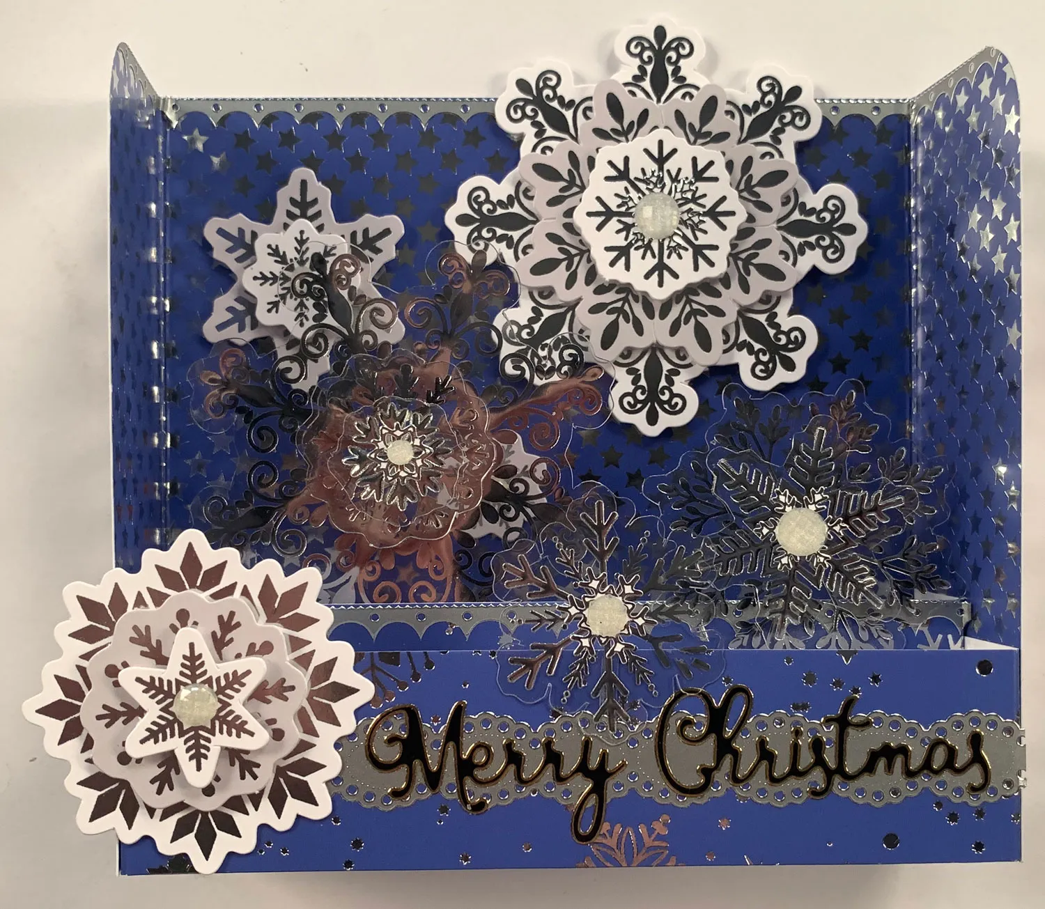 For the card: Cut 8¼"x5" Let It Snow blue stars cardstock. Place it horizontally on the scoreboard and score it 1½" from each end. Punch the two upper corners to round them. Crease the scores in valley folds. Place a silver border Dazzles™ along the upper edge, trimming the excess.