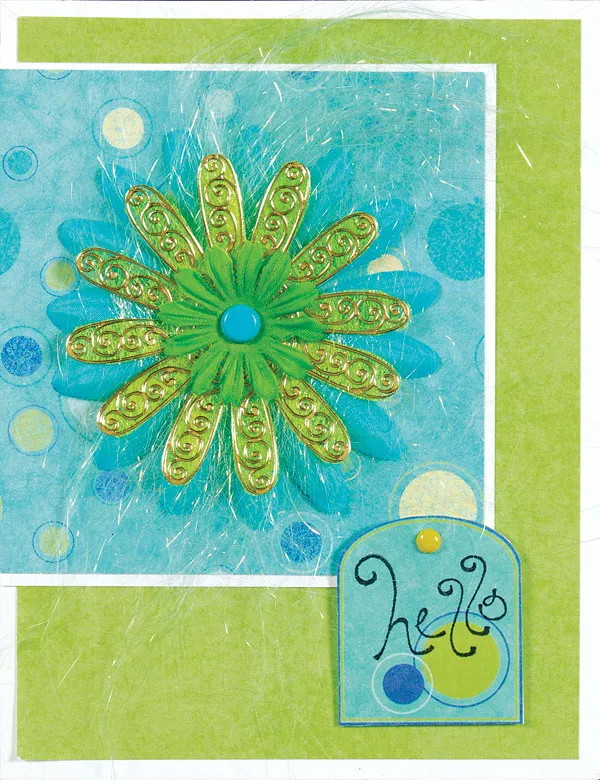 Press lime green DicroFiber™ until stiff. Adhere a large Dazzles™ flower and cut around the outside edge. Press only the center portion of the tuft of lime at the center to secure and place behind the flower. Layer the flower with a large blue silk flower and a small lime silk flower and secure to the blue dot square. Glue the square flush with the left side of the card.
