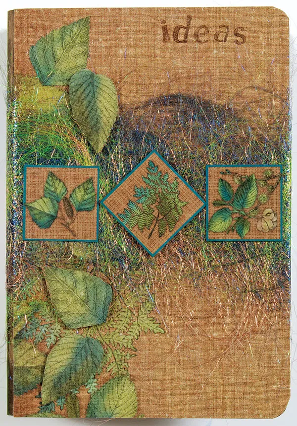 Glue 2 square leaf cut outs over the fiber on the front cover. Foam tape another square on point between the first 2. Cut leaves from the remaining leaf border paper and foam tape to the binder border.