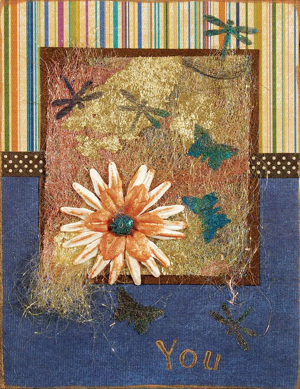 Apply copper StazOn® to a small and medium paper flower. Layer and secure to the bottom left corner of the DicroFiber™ fabric using a mini brad. Glue the fabric to the center of the glimmer paper. Roll a scrap of the blue fabric into a ¼” wide ball and glue to the center of the flower, over the brad. Press one end of a small tuft of gold DicroFibers™ and glue to extend from under the flower. Stamp a greeting at the bottom of the card front using copper StazOn® ink. Glue more bugs around the card front.