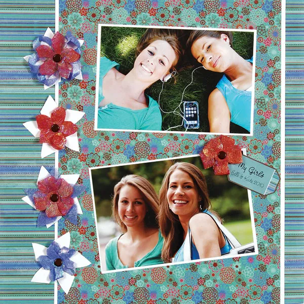 Adhere 4 flowers over the left page border and 1 pink flower to the top right corner of the bottom photo. Write on the coordinating tag and glue to extend from under the pink flower.