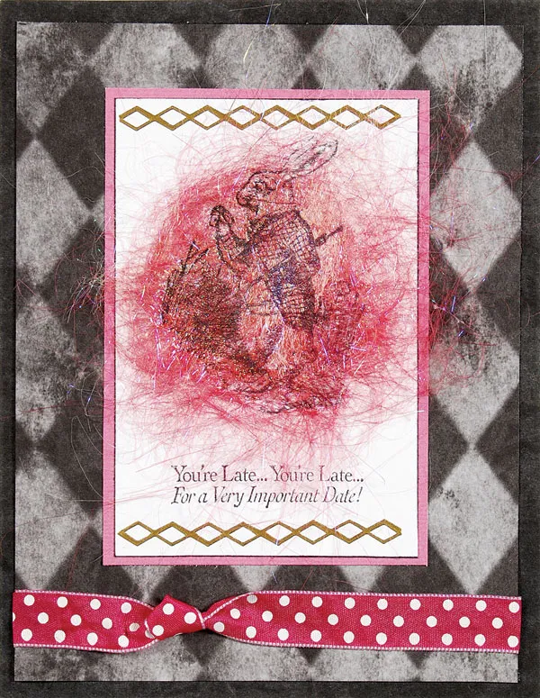 Inside the card: Stamp “You’re Invited” to the top left on the card inside back. Stamp Alice and a pocket watch in the right top corner. Glue a 1 ½” wide diamond border with a pink matted top edge to the bottom of the card. Stamp the inside quote and glue the Mad Hatter’s embossed seal to the left.
