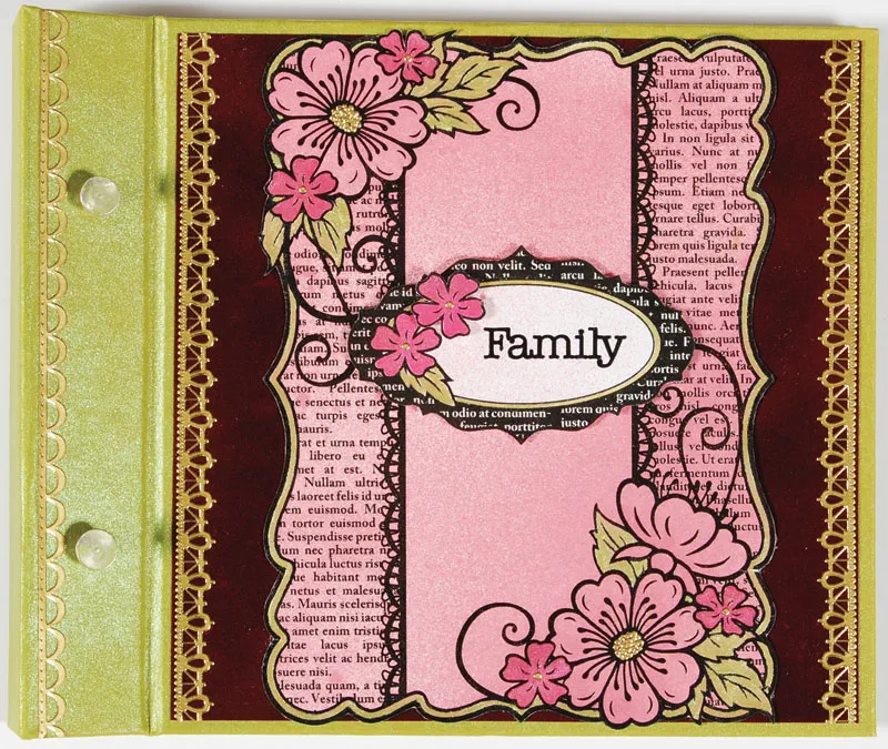 Cut a 6 1/4" square piece of burgundy suede, then add gold border stickers to left and right sides. Glue the square centered to the front of the album. Add another border sticker to the left edge near the posts as shown. Glue the card topper centered to the burgundy suede square. Embellish the flower centers with tiny dot stickers from the Dazzles™ sheet (“innies” from some of the borders).