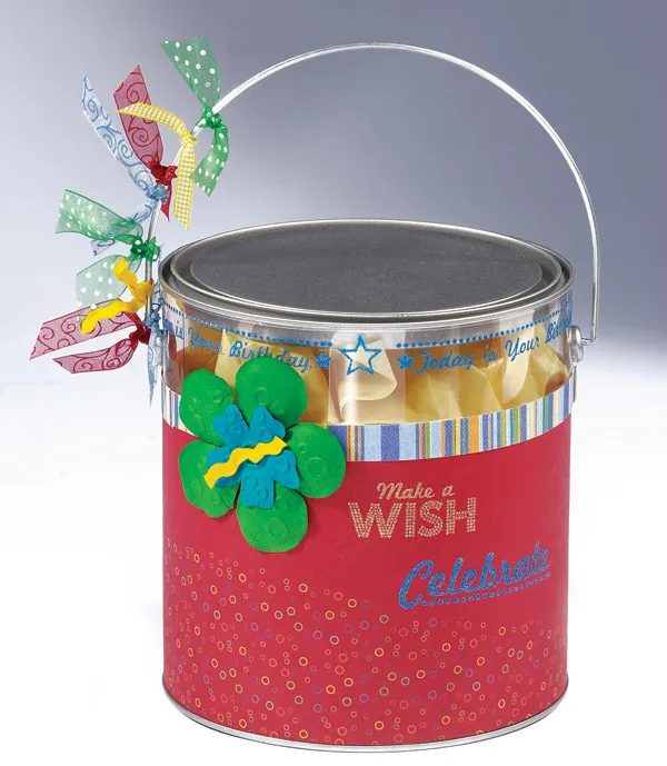 Cut a 5/8”x12” strip of striped paper and glue around the top edge. Adhere the “Today is your birthday” with the dot border around the top edge of the pail, placing a large star between each group of words. Apply blue glitter to the adhesive.