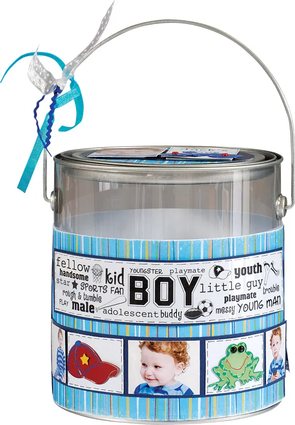 Draw extra detail to the frog, hat and bicycle by painting the embossed areas. Cut 11/2"x2" mats, add pen work and then add the Brad Buddies. Crop several photos and mix with the Brad Buddies around the pail.