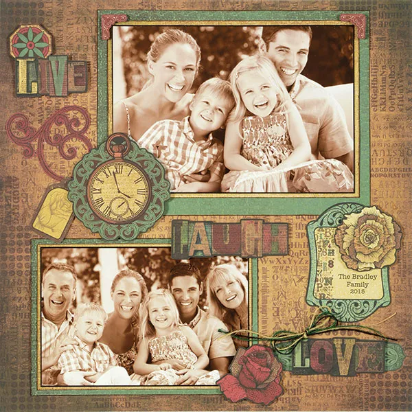 Press out the Letter Press die cuts to use as shown. Write or computer print family name and year on the bottom right portion of the ivory label with teal/black frame die cut. Glue on the page, overlapping the lower right corner of the large photo mat. Foam tape the brown/tan flower die cut on the label above the words. Foam tape the red corner die cuts on the top corners of the large photo mat. Glue the red swirl die cut on the page to the left of the large photo. Foam tape the teal/red flower die cut and the “LIVE” die cut above the red swirl, overlapping each other on the left side.