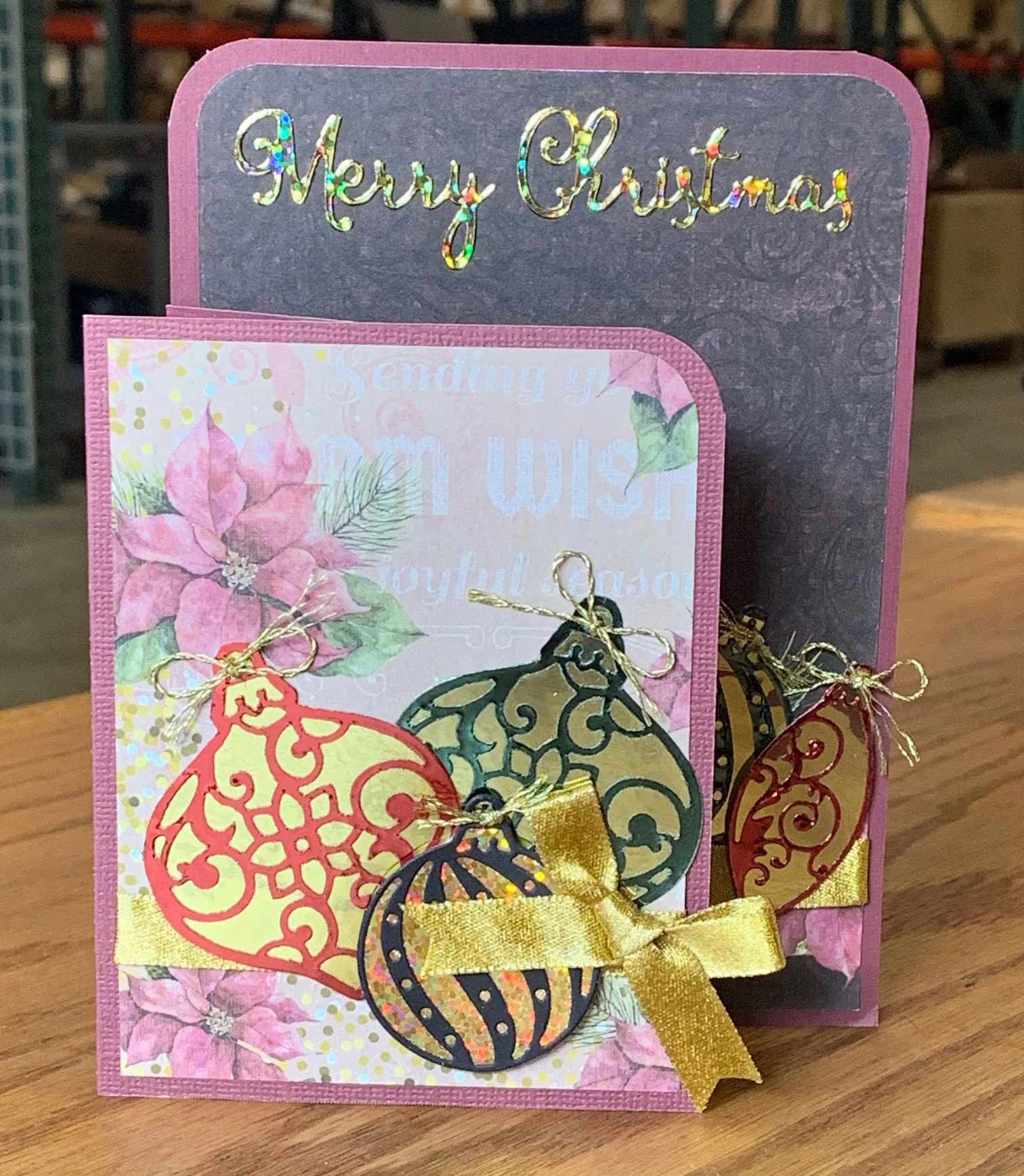 Die cut a large ornament from black cardstock and back it with gold sparkle paper as before. Die cut two of the small and medium ornaments each from dark red and green Shine sheets, then back these ornaments on gold Shine sheet. Glue and foam tape the ornaments over the poinsettia border as shown.