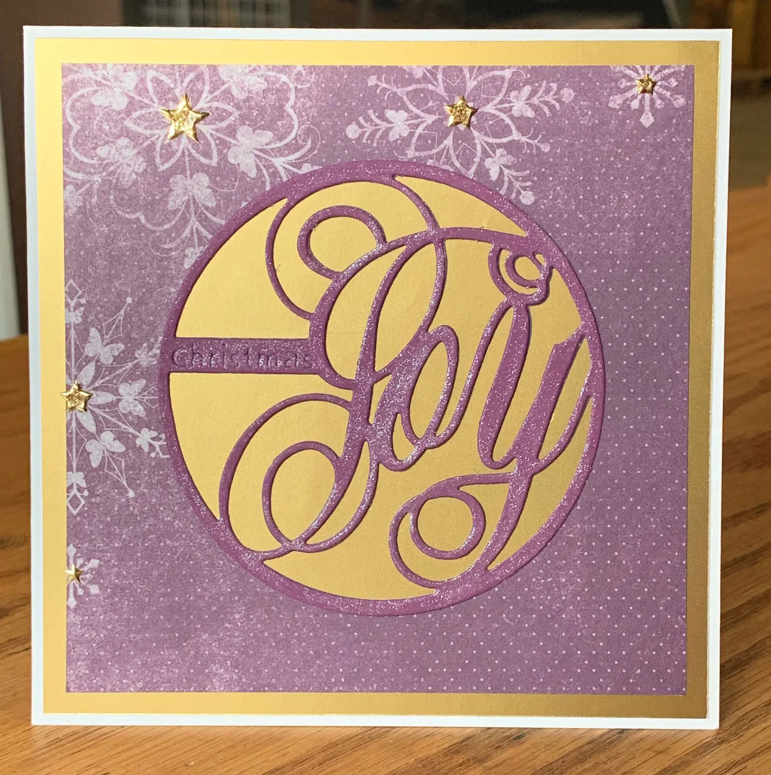 Die cut the “Christmas Joy” circle from purple cardstock and paint glitter ink over the front. Glue the die-cut inside the circle opening on the front. Place gold star Dazzles™ in the snowflake centers.