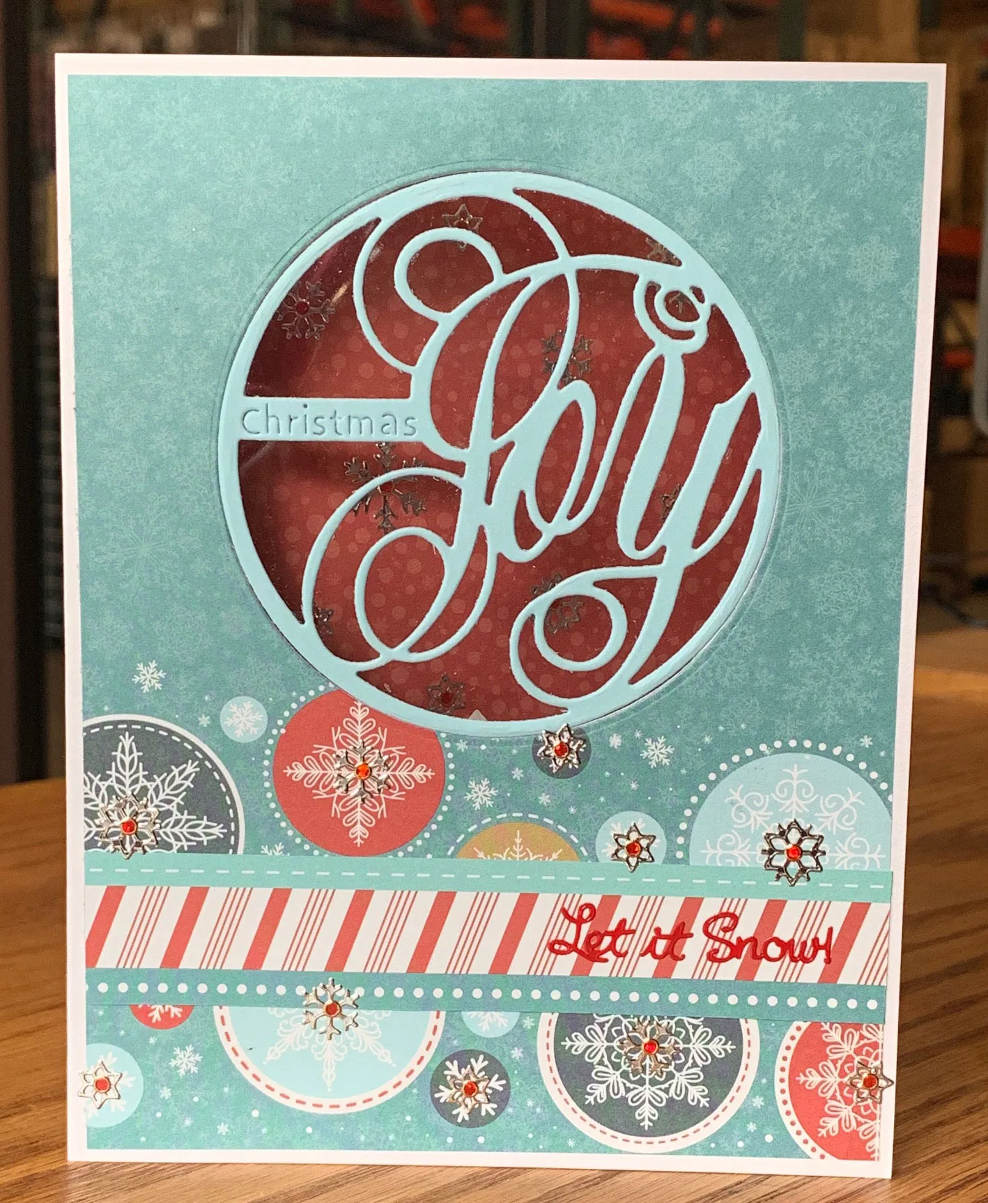 Open the card and die cut the Christmas Joy outer circle from the upper center. Die cut the 3¾" circle from acetate. Open the card and use acrylic glue to attach it to the inside front, centering it over the opening. Close the card. Die cut the Christmas Joy inner circle from aqua cardstock and glue it to the acrylic window.