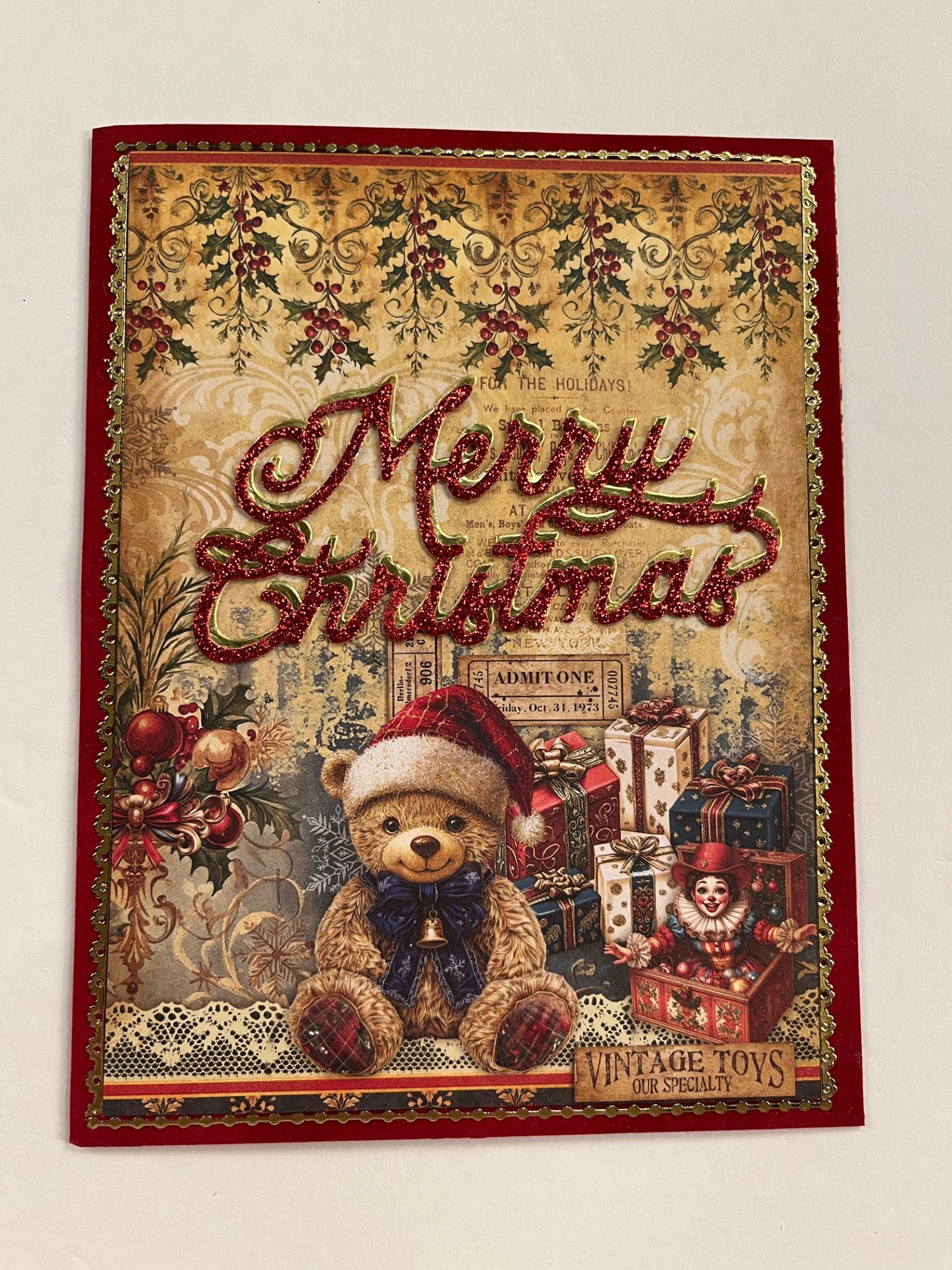 Cover the card front with tomato suede paper. Cut 4 ½”x6 1/8” paper with the teddy bear, presents, Vintage Toys sign and holly at the top. Place on the craft mat and use a blender brush to apply velvet fawn ink to the edges. Glue to the card. Place gold Thin Line Dazzles™ around the edge of the paper.