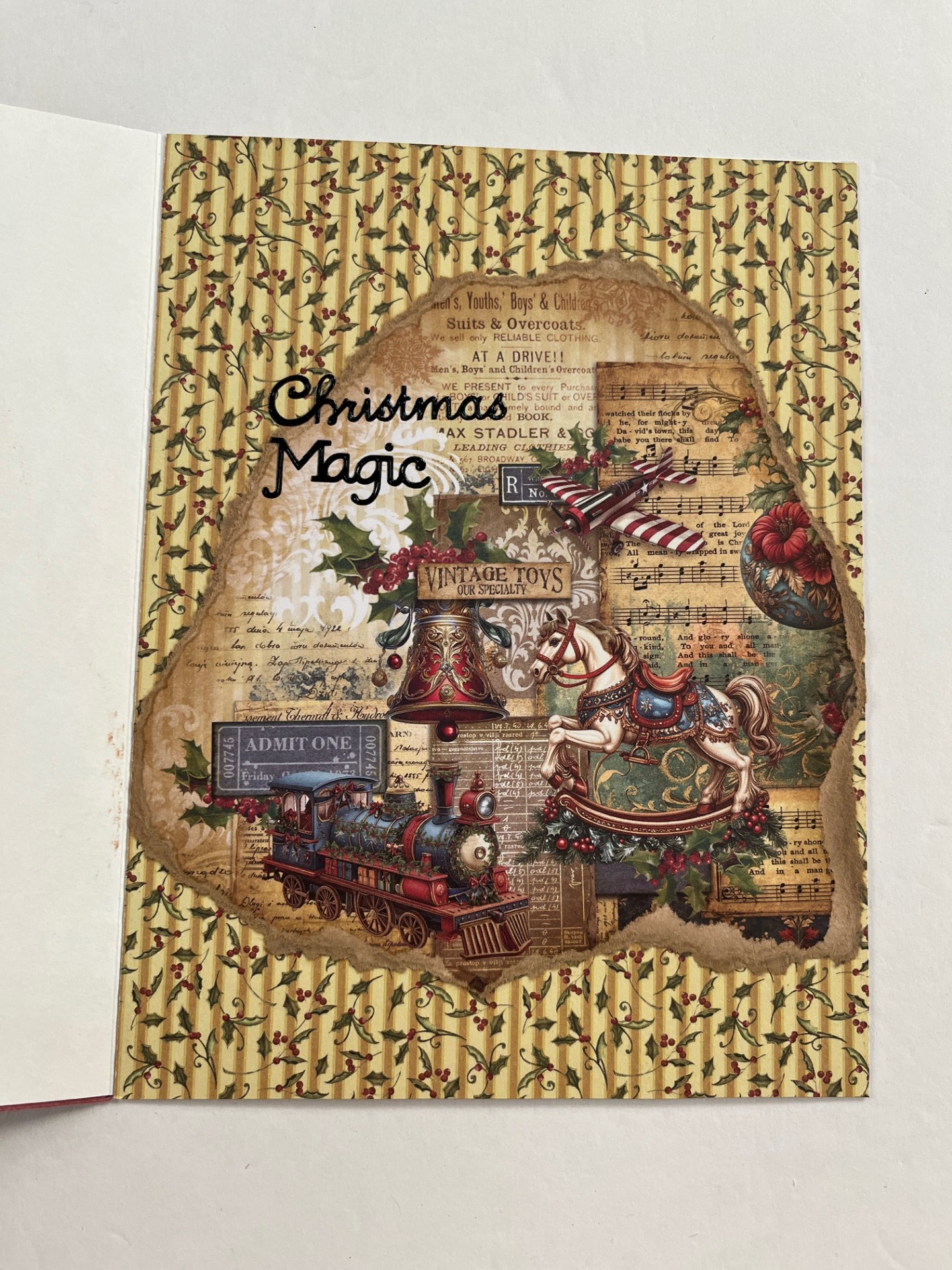 Card inside: Cover the inside with yellow stripe/holly paper. Tear around the collage shown. Place on the craft mat and apply velvet fawn with a blender brush to the edges. Glue to the card. Place “Christmas Magic” from the Christmas Greetings Dazzles™ set as shown.