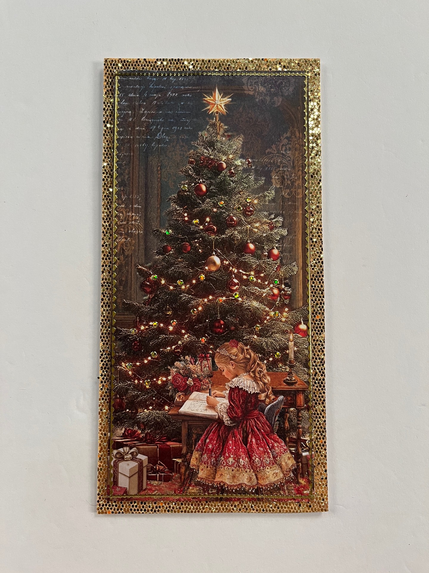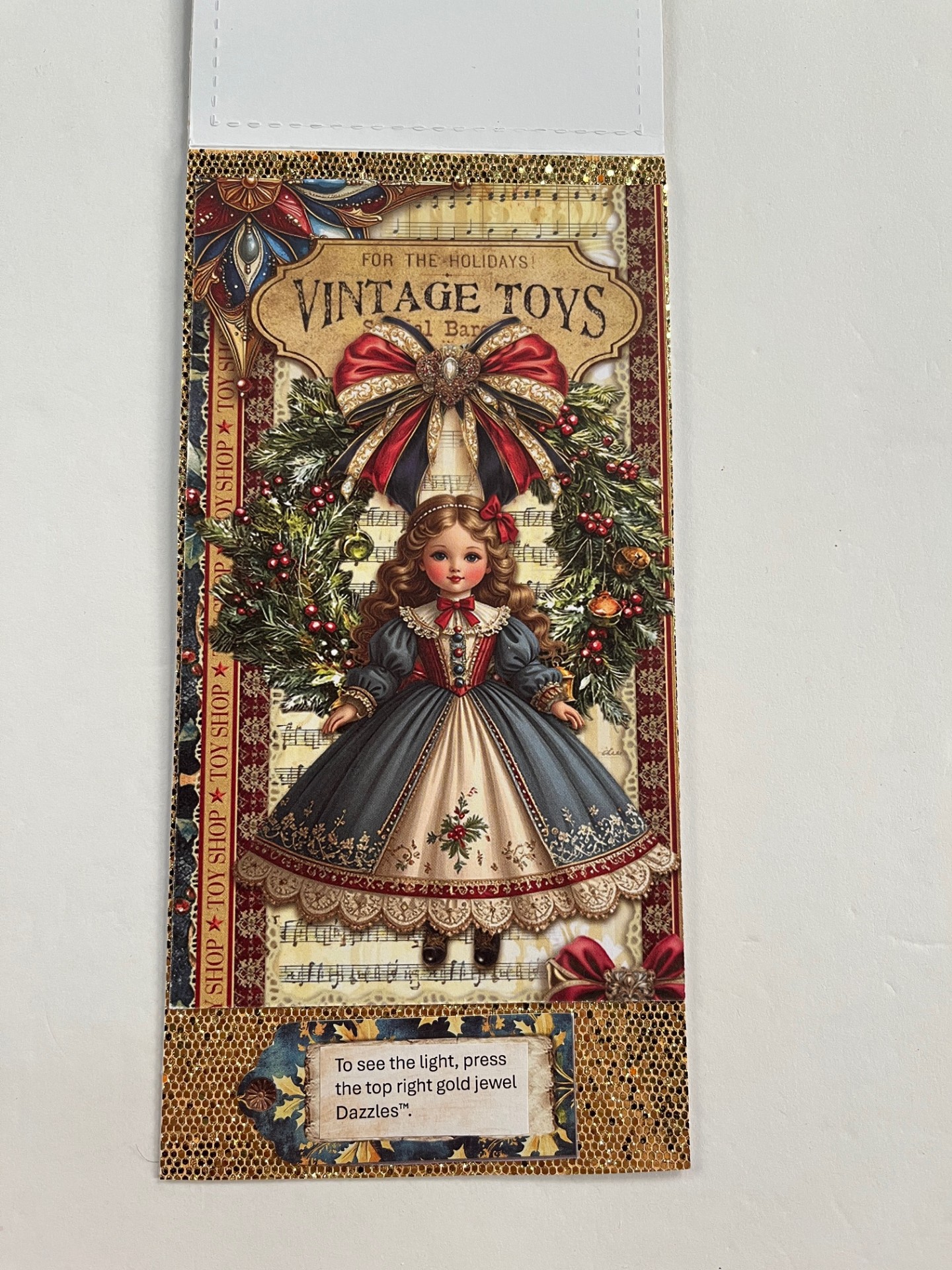Inside: Cover the inside with gold sequin cardstock. Cut out the Vintage toys, doll large cutout and use extra sticky tape to attach to the card. Cut out and glue the tag below. Type the message in 11 point font and cut out. Place a well-used velvet fawn ink pad over the top then glue to the tag.
