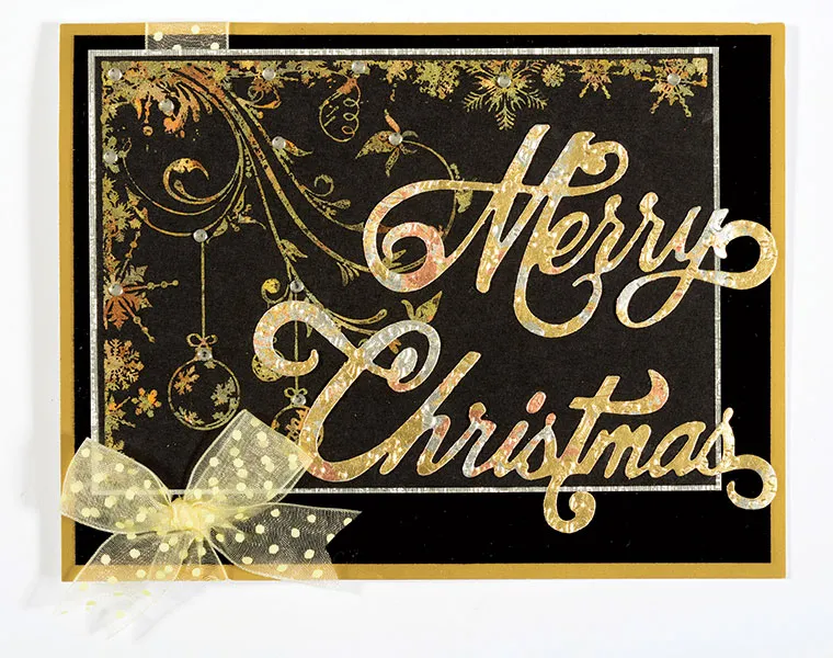 Use the gluepad to apply glue all over 5½”x4½” white cardstock and heat set. Apply and burnish Manchester Tart Megaflakes to create a metal flake cardstock piece. Follow your die cutting machine manufacturer's instructions to cut “Merry Christmas” die-cuts from the piece (save the surrounding scrap cardstock). Place the “Merry Christmas” die-cuts in the snowflakes embossing folder and emboss. Emboss the saved scrap cardstock and save for your card inside. Glue the embossed die-cuts in places, as shown. Place baby bling onto the stamped image, as shown.