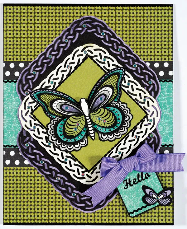 Layer together the butterfly papier tole embellishment with foam tape and glue angled on the center of the green/white embossed die-cut. Add Teal Jewel Dazzles™ to the decorative edges of the die-cuts as shown. Trace and cut out a “Squared Tag A” shape on teal textured paper. Mat on black cardstock with 1/16” borders. Foam tape angled on the lower right portion of the card as shown. Add Black Thin Lines Dazzles™ on the bottom of the tag, and at top and bottom edges of the card.
