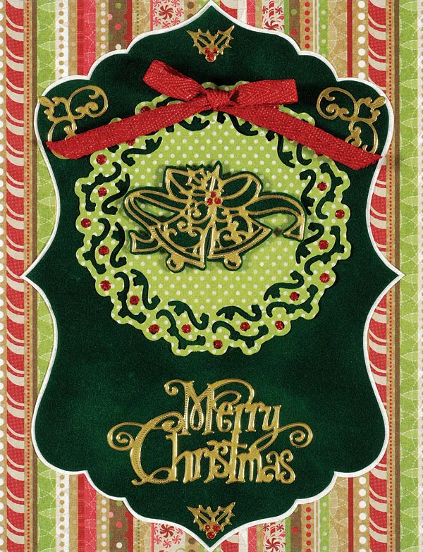 Die-cut the Vine Circle using Christmas Sweets green/ivory dots paper. Glue centered on the label shape, 7/8” from the top of the label. Place “Merry Christmas&rdquo,; small Holly Leaves/Berries, and Swirl Corners Dazzles™ on the label as shown. Back the small Bells Dazzles™ on Forest Suede leaving a thin border. Foam tape centered inside the wreath.