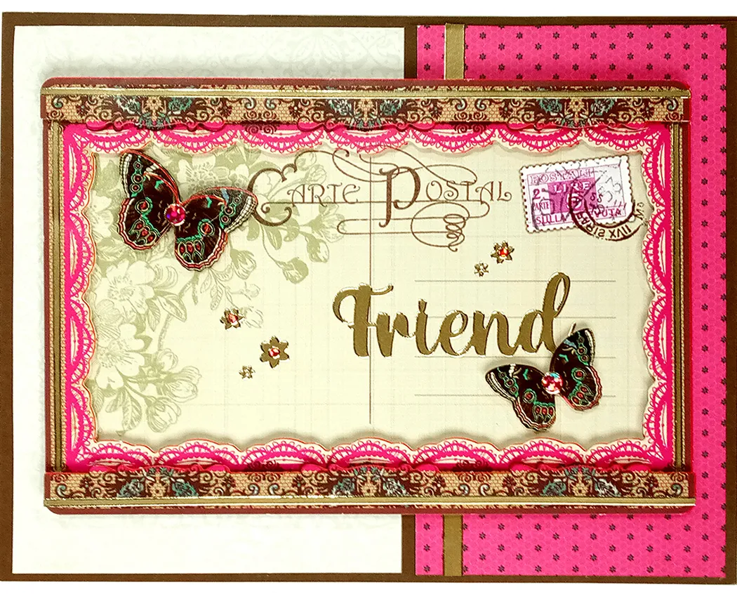 3. Assemble the Postcard Pyramid postcard design with foam tape between the layers. Place gold straight line Dazzles™ near the outer edges, trimming the excess. Place gold “friend” Dazzles™ on the post card and foam tape an extra art butterfly at the lower right. Place small gold flower Dazzles™ and jewel Dazzles™ as shown.