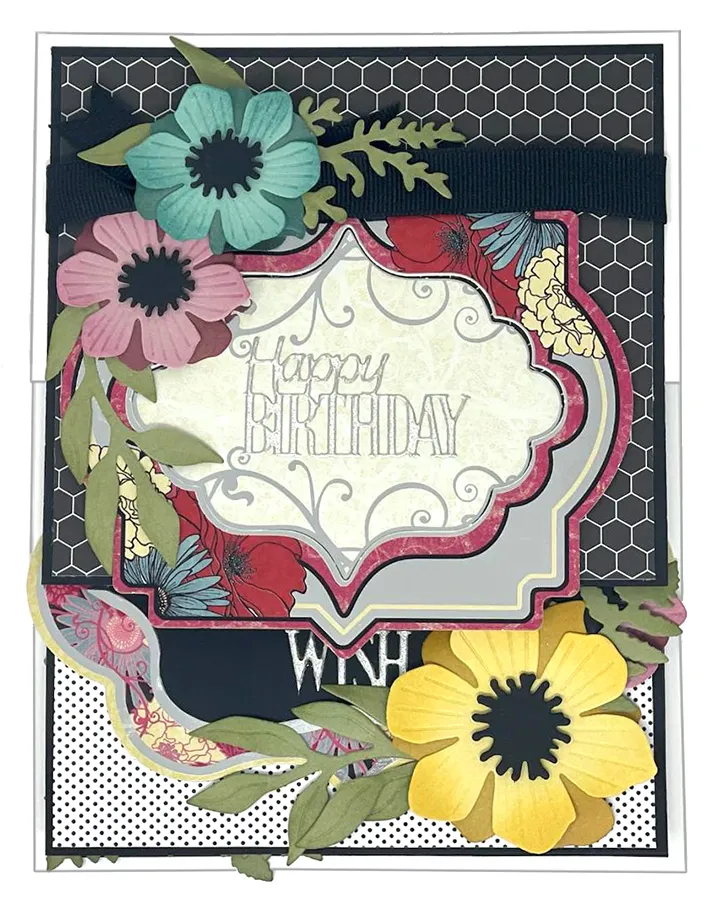7. Place the Fresh Cut red floral frame over black cardstock and cut along the edges. Glue the frame to the panel as shown. Place silver pearl “the more candles…” Dazzles™ greeting on the label as shown. Glue and foam tape two flowers to the panel, then glue leaf sprigs around the blossoms as shown.