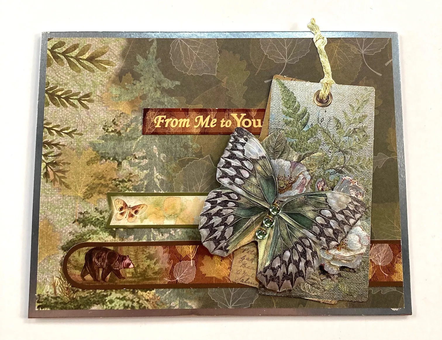 3. For the inside: Cut 5"x3½" brown/green leaves cardstock and mat it on silver cardstock with ⅛" borders. Glue it centered on the inside. Glue the “thank you” cutout extending off the right end of the brown cardstock. Assemble the fern paper tole design with foam tape, then glue it and foam tape an extra art small butterfly as shown. Place a crystal sticker on the butterfly’s body.