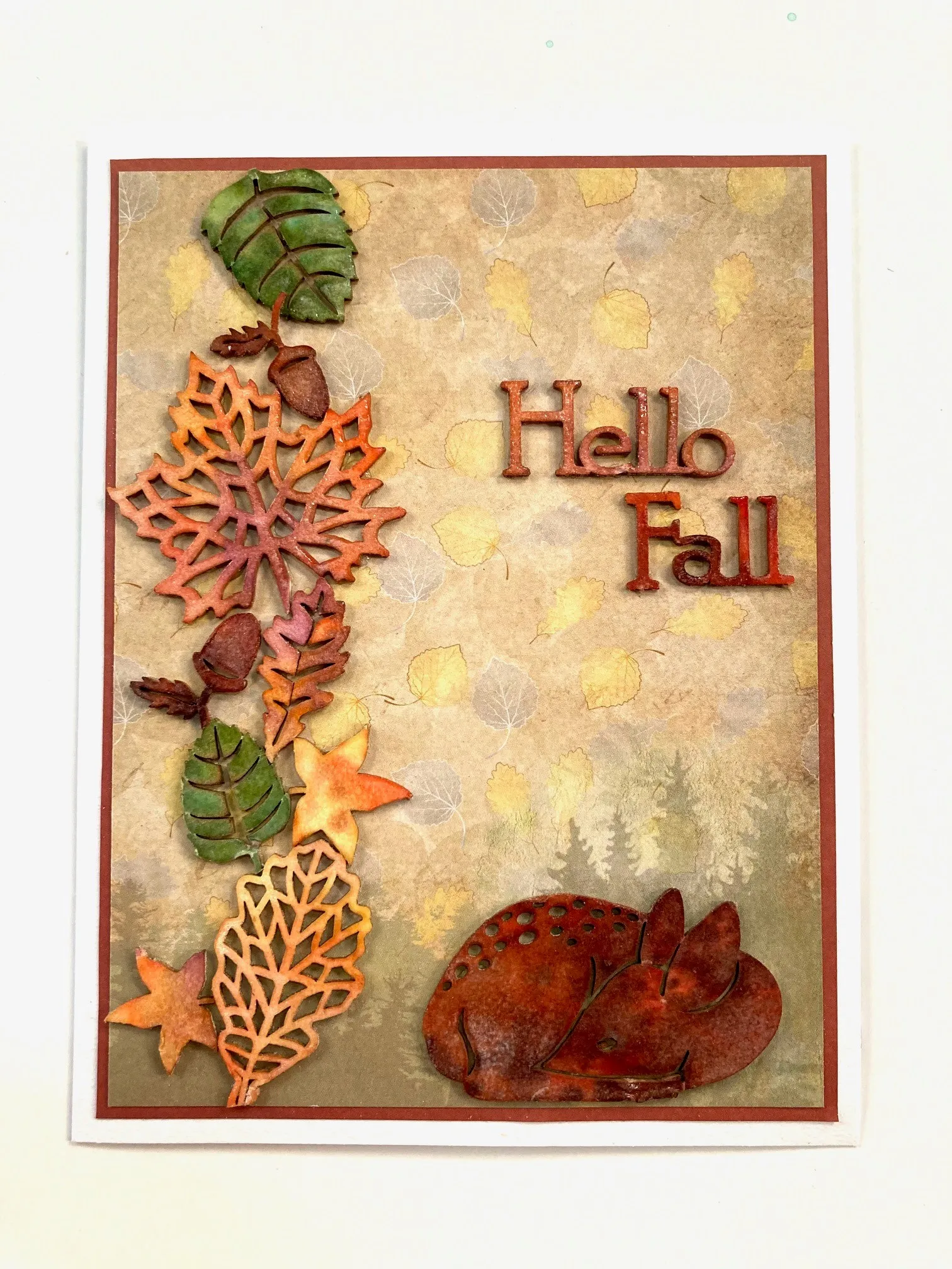 1. For the card front: Place a card with the fold on the left. Cut 4½"x6" Nature’s Touch gold border cardstock with the trees in the lower right corner and mat it on rust cardstock with ⅛" borders. Glue it centered on the card front.