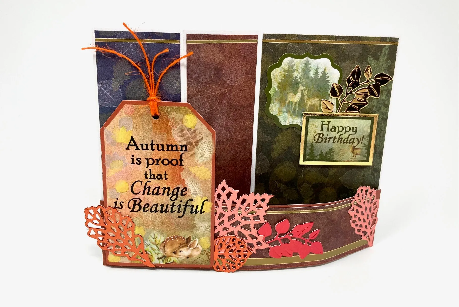 4. Attach two strands of orange jute to the “autumn is proof…” tag die-cut, then foam tape it to the left panel as shown. Mat the “happy birthday” cutout on gold Mirri cardstock, then glue the deer die-cut and foam tape the greeting to the right card panel as shown. Die cut leaves from the Mirri cardstocks and glue them to the card as shown.