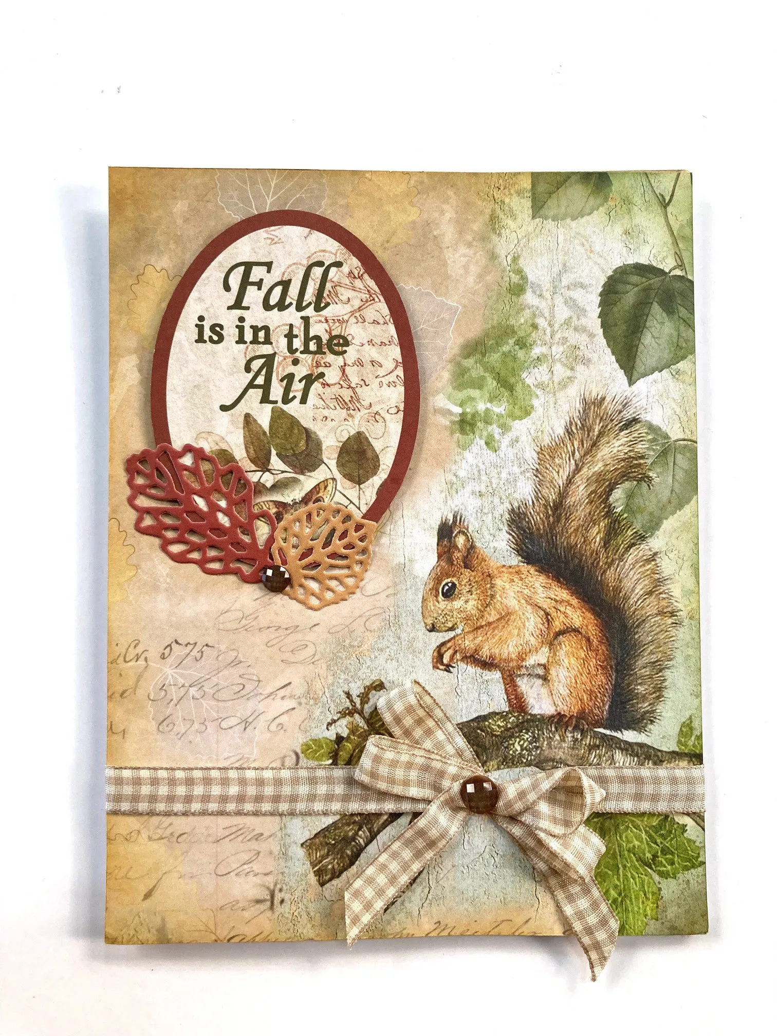 3. For the front: Cut 5"x6½" Nature’s Touch squirrel cardstock. Ink the gold edges with Mustard and the green edges with Khaki. Wrap tan gingham ribbon across the cardstock 1" from the bottom and glue the ends to the back. Glue the cardstock to the card front. Make a 4-loop bow with the same ribbon and tie the center with thread. Glue the bow to the first ribbon, 1¾" from the right edge.