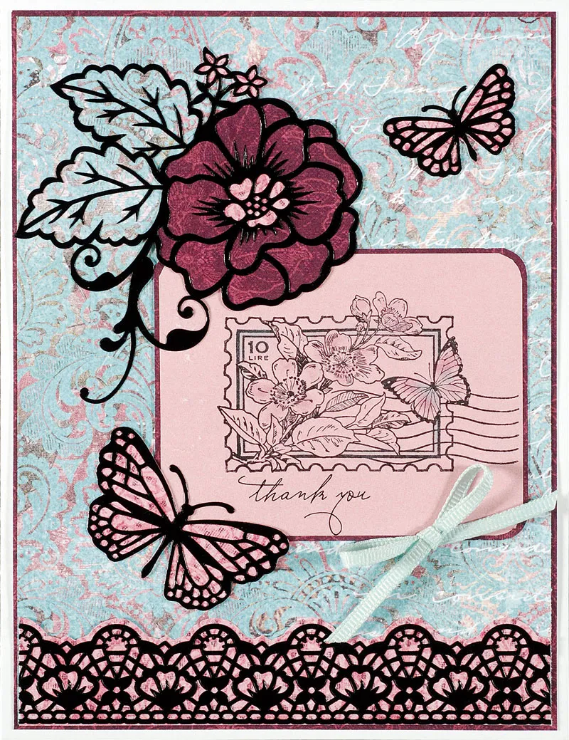 To color the stamped image, add dark aqua chalk near the center of the butterfly wings and in the inner border of the postage stamp. Add plum chalk to the outer areas of the butterfly wings and on the flower petals. Tie an aqua ribbon bow and Zot near the lower right edge of the pink cardstock.