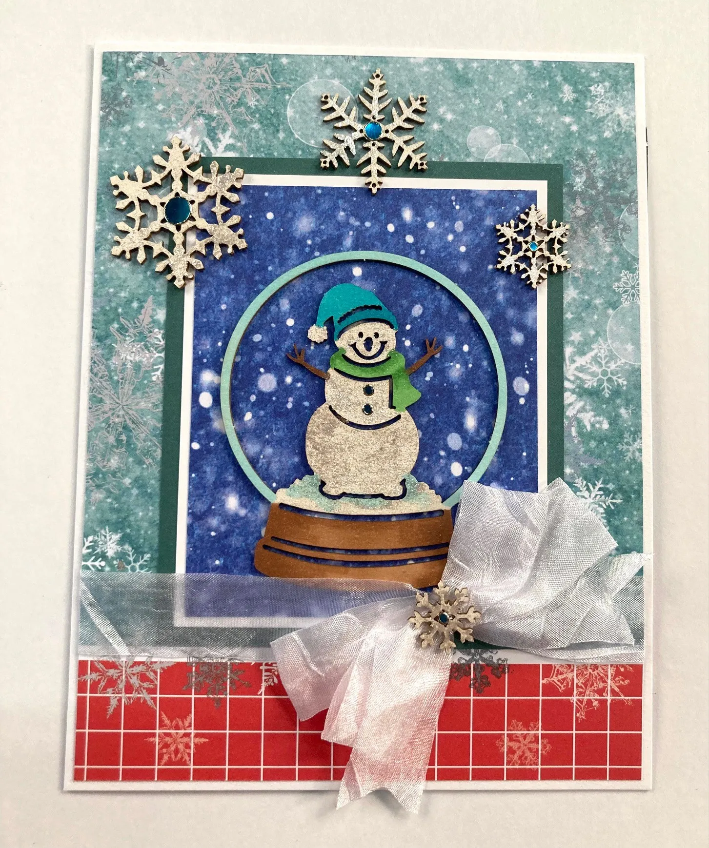 3. Cut 3"x3¾" Snowflakes & Snowfolks dark blue snow cardstock and mat it on white cardstock with 1/16" borders. Mat it again on dark teal cardstock with ⅛" borders. Glue the snow globe to the center, then glue the rectangle to the card front, slipping it under the ribbon.