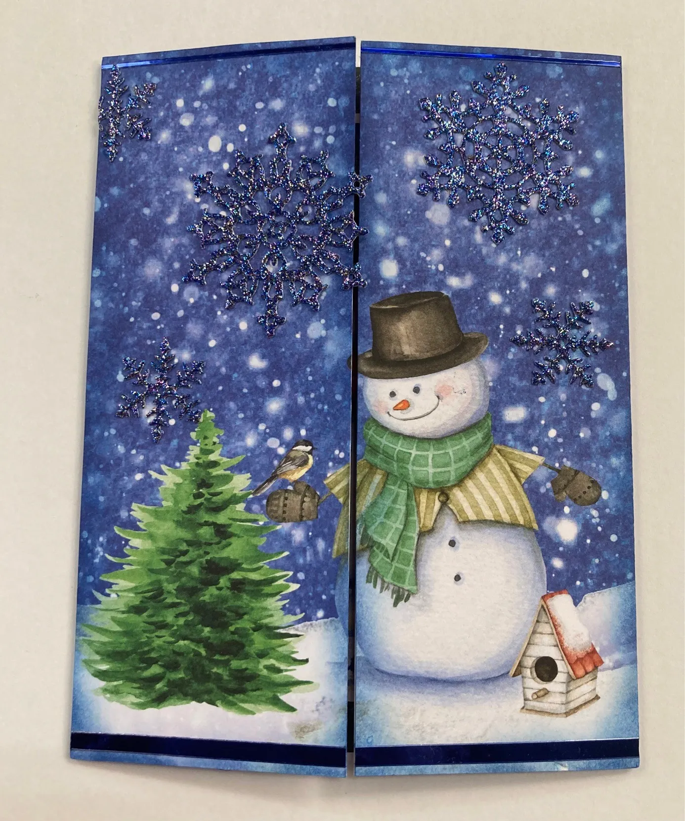5. Mat the snowman cutout shown on white cardstock with ⅛" borders, then glue it just to the 1" wide center panel. Foam tape the “warm winter wishes” die-cut near the bottom. Die cut more glitter snowflakes and glue them to the inside as shown.