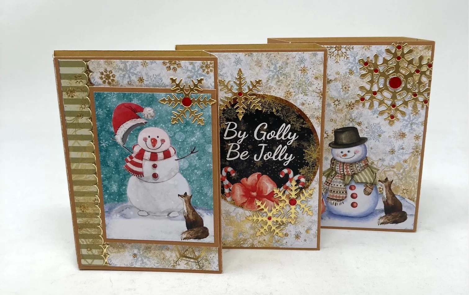 6. Cut out the snowman cutout shown and mat it on gold cardstock with 1/16" borders. Foam tape it to the left box front. Cut the “by golly be jolly” circle die-cut to 2⅛" wide, trimming off the left side, and glue it to the center panel. Die cut snowflakes from Gold cardstock and glue them to the large panels as shown, then decorate them with jewel Dazzles™.