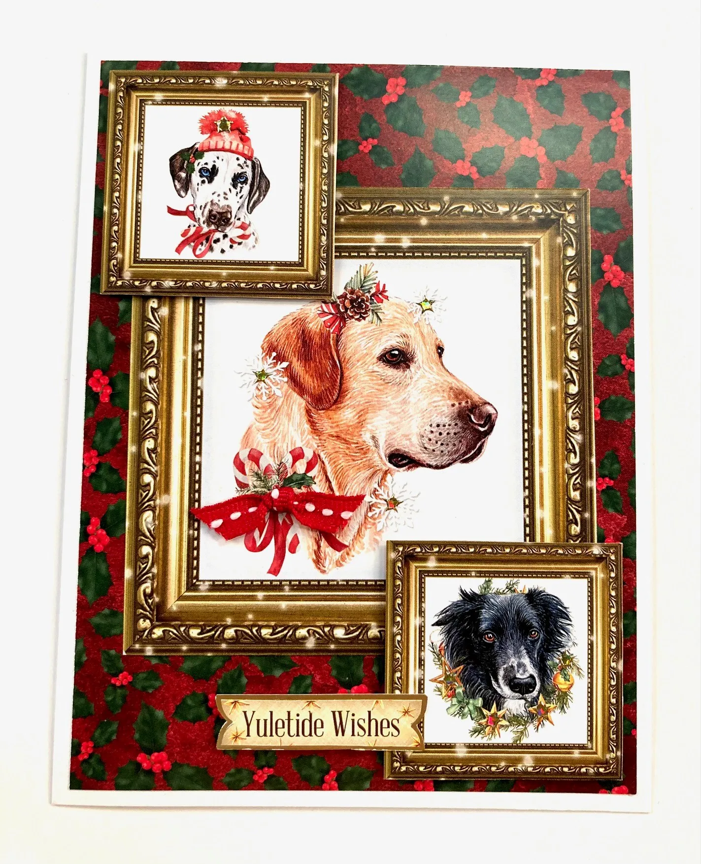 2. Cut out a large framed dog portrait and two smaller ones. Glue the large frame on the center front, then foam tape the smaller portraits as shown. Cut out the “yuletide wishes” label and mat it on Mirri with narrow borders. Foam tape it overlapping the lower portrait as shown.