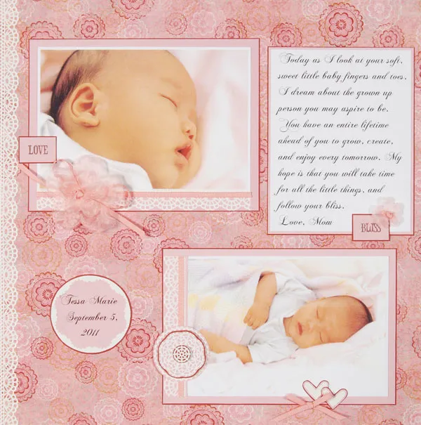 Back the two medium medallion stickers with pink cardstock and trim around the edges. Mat the smaller one on red, leaving a very thin border. Mat the small one on red, trimming around the edges. Layer together with foam tape and add to the lace border of the lower photo. Mat the heart “innies” on pink, then red leaving a thin border on each. Glue overlapping to the edge of the photo as shown. Add ribbon near the hearts. Thread pink ribbon through two sheer pink flowers and tie a knot at the center. Zot centered over a ribbon bow and Zot over the upper matted photo. Tie a tiny sheer pink flower with ribbon at the center and Zot near “bliss”.