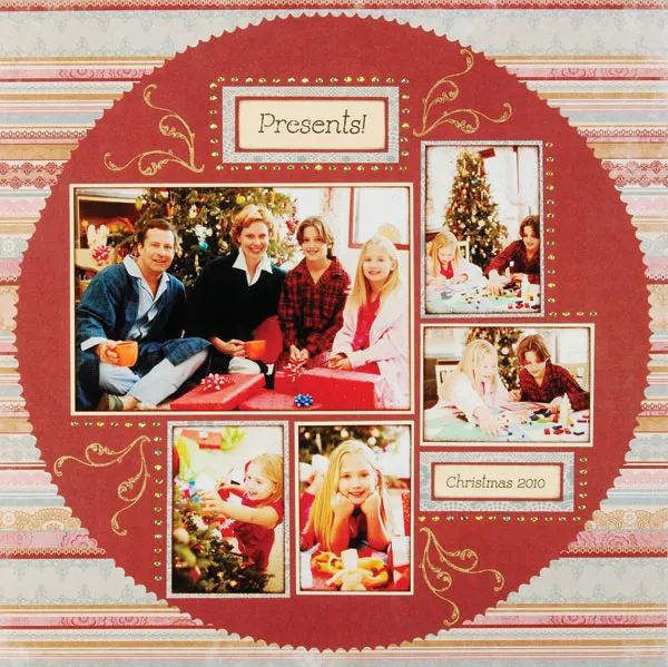 Use a ruler and pencil to mark dots 1/4” apart around the title, caption, and some of the photos (to mark where Jewel Dazzles will go). Apply a small gold Jewel Dazzle over each mark. Stamp swirls from the Artful Collection stamps in the corners as shown, using metallic gold Stazon.